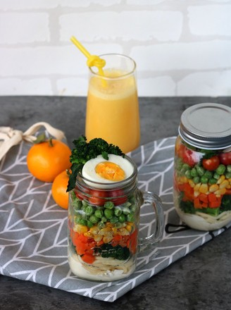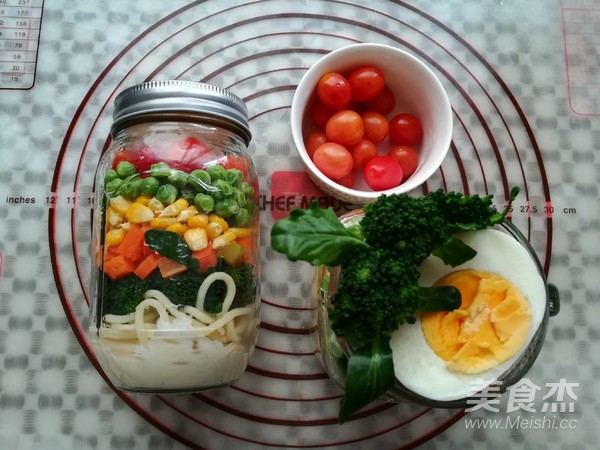 沙拉酱上依次放上意面,西兰花 ,胡萝卜,玉米,豌豆和水果,最后放上半个煮熟的鸡蛋