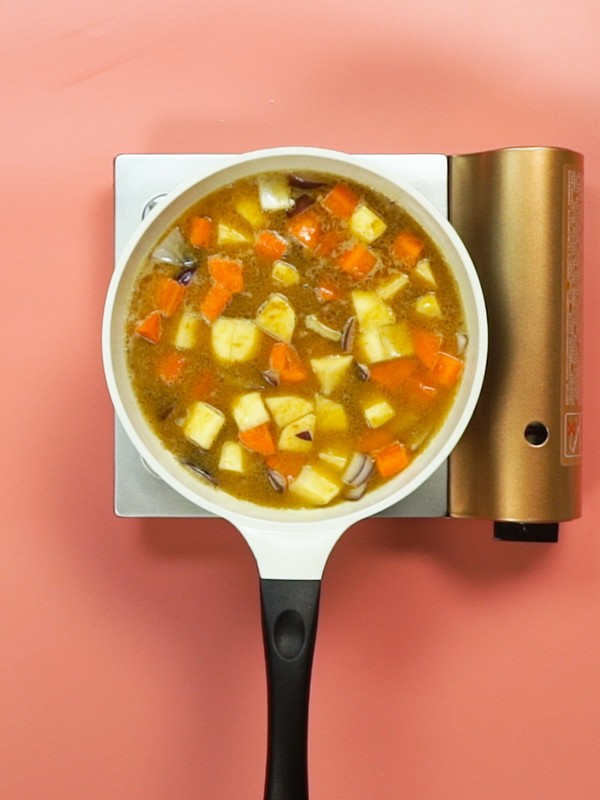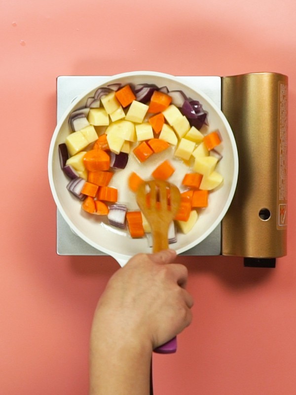 倒入土豆,胡萝卜,咖喱翻炒均匀