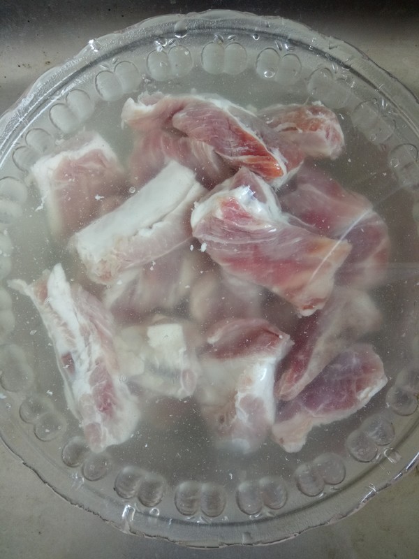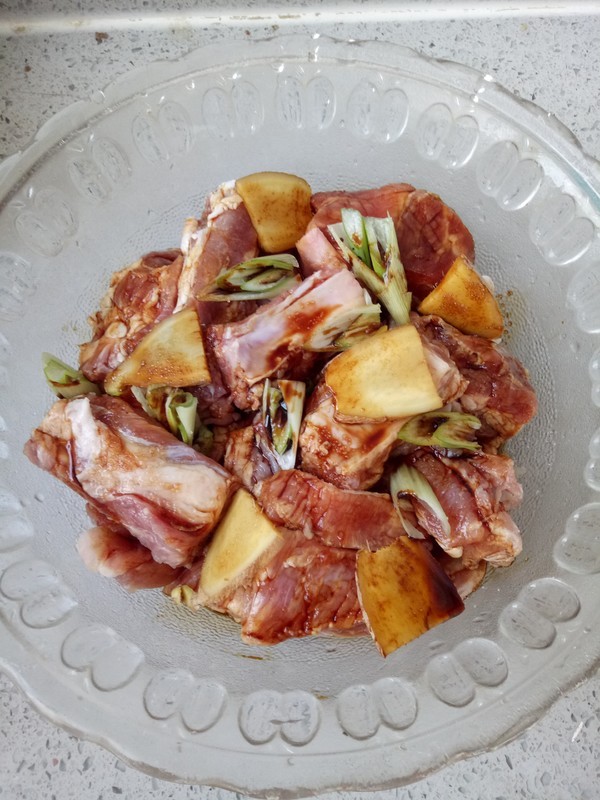 在排骨中加入葱段,姜片,酱油,蚝油,料酒,花椒油,盐等。