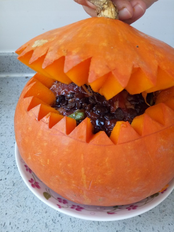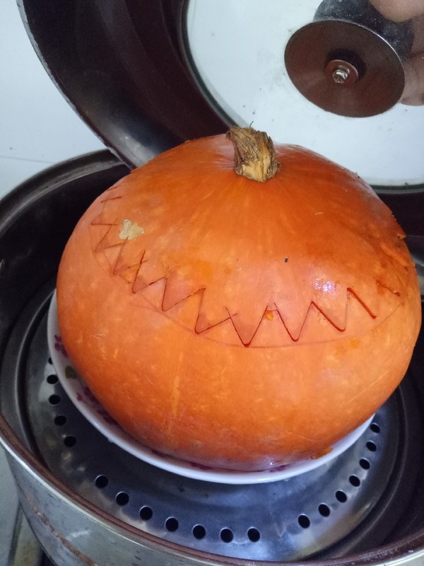 盖上南瓜盖子,整个南瓜放进一个深盘里