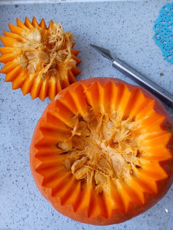南瓜一分为二,可以直接切成齐的也可以用这种刀切出花边。
