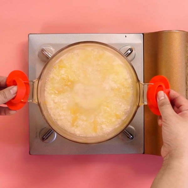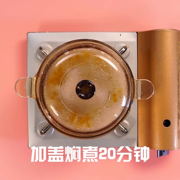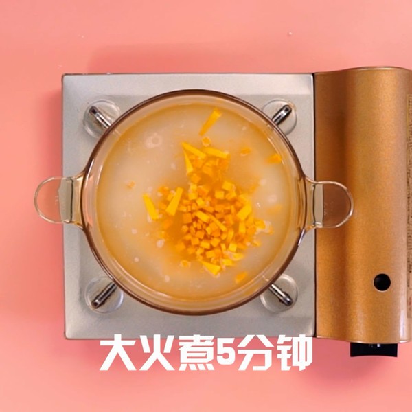另取锅加入清水1.5升,倒入大米,倒入南瓜条100克