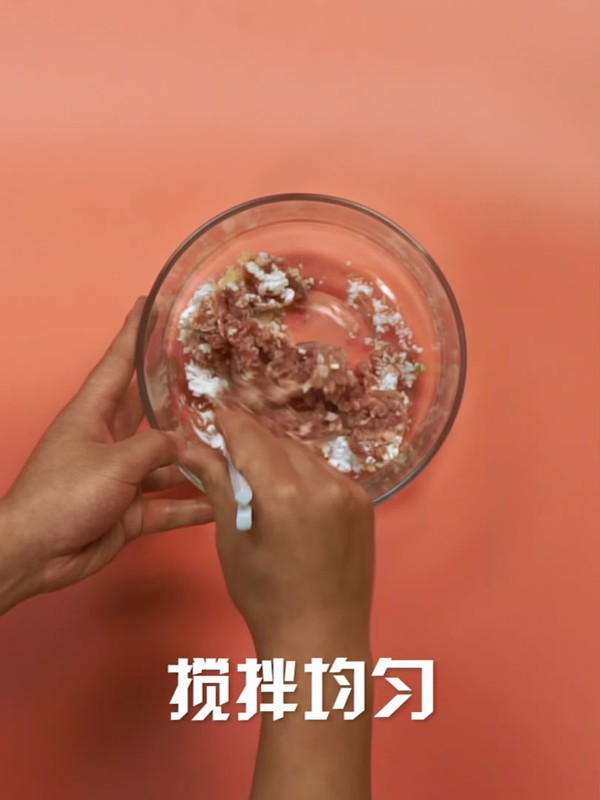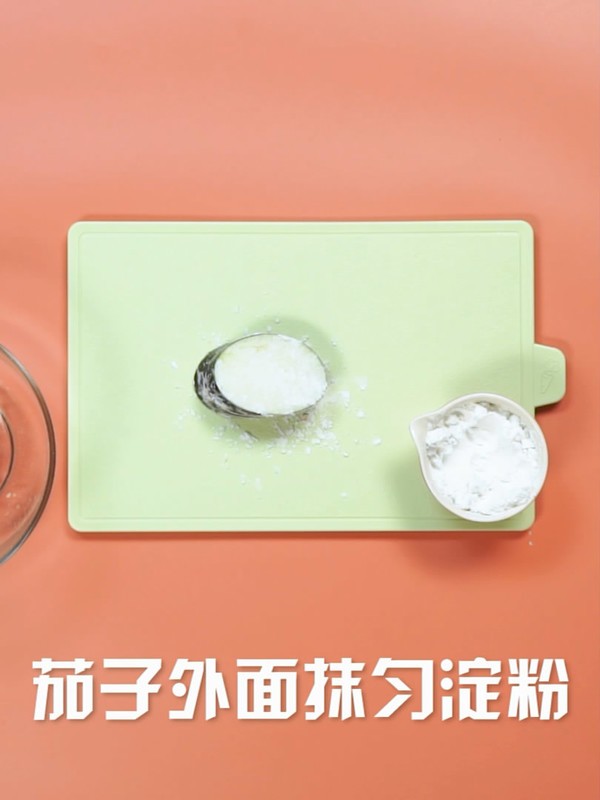 茄子里放入适量猪肉馅,茄子外面抹匀淀粉