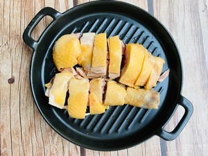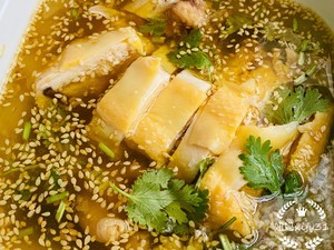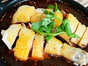 鸡冷却后取出,切段摆盘。佐以酱麻油蘸着食用