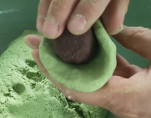 2斤糯米粉,200克淀粉,倒入艾草泥搅拌,期间加入150毫升食用油