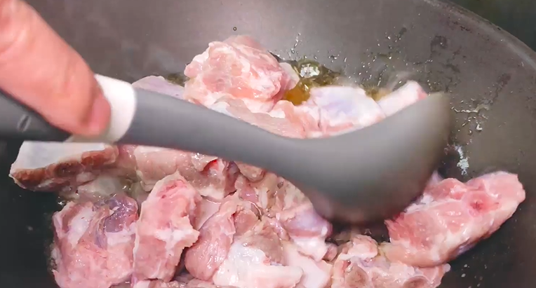 冒气泡时,将沥干汤汁的排骨放入干炒
