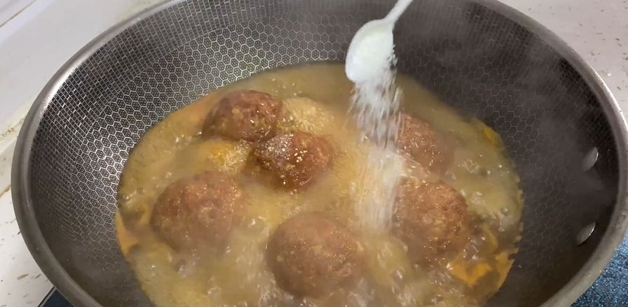 国内倒入色拉油,油温六成热时,放入肉丸子