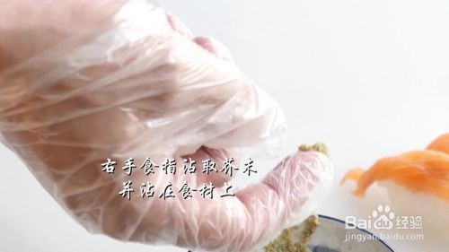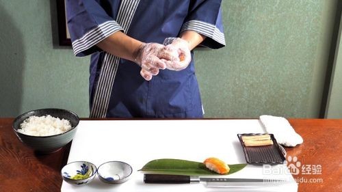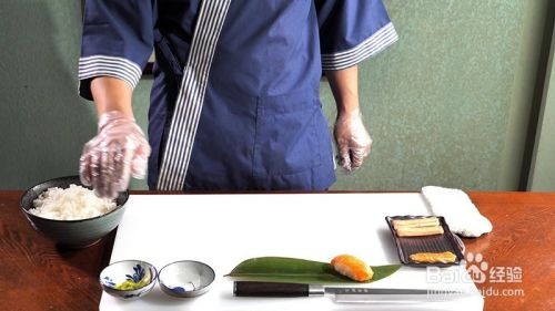 工具定位以便于工作,右侧放饭盆与手醋,芥末。左手放食材 (现在很多寿司店在做手握寿司时已经不添加芥末了,后面吃寿司的人根据自己的喜好再沾酱油和芥末,传统寿司是加有芥末,因为在日本饮食爱好比较一致)