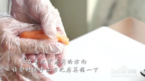 以右手改变寿司的方向,让食材位于上方之后再握一下。