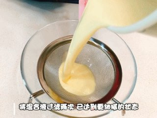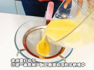 将鸡蛋打均匀,过滤一遍后加入到已稍微放凉的牛奶液中。