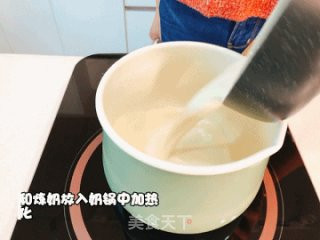 将淡奶油、牛奶、炼奶和细糖放入奶锅中加热,并不断搅拌到糖完全融化。