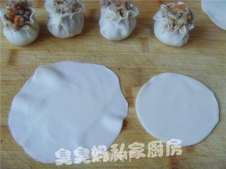 烧麦皮是现成的饺子皮,用擀面杖把皮四周擀薄,就成了烧卖皮。