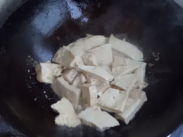 起油锅,葱姜入锅煸香。豆腐入锅炒。用铲子随意划成不规则的块。