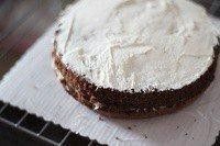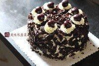 盖上第二片蛋糕,涂樱桃酒,涂奶油,铺上黑樱桃碎 盖上第三片蛋糕,把整个蛋糕外面涂上奶油, 在蛋糕的表面撒满黑巧克力碎 挤上几朵奶油花,点缀上黑樱桃