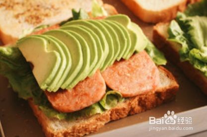 铺上午餐肉,午餐肉其实也可以叠起来放,像牛油果那样。码上牛油果,在牛油果上撒些海盐和黑胡椒调味。