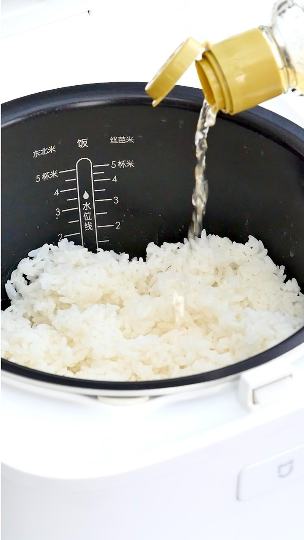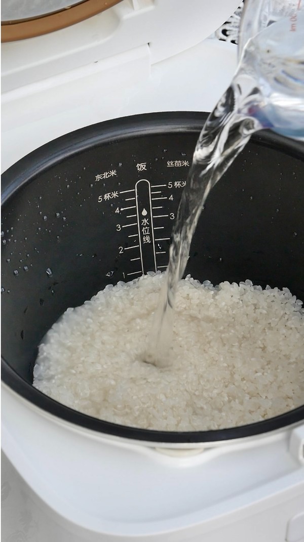 准备150克越光米,快速轻柔地淘洗干净; 倒入165克热水,浸泡15-20分钟,让米充分吸收水分,电饭煲精煮1小时后,不要马上揭盖,焖15-20分钟;