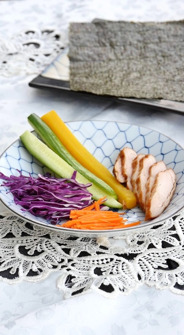 准备好黄瓜条、紫包菜丝、水果胡萝卜丝、烟熏鸡脯、寿司专用酱瓜及紫菜;可以将紫菜放入100度烤箱内,烤2分钟,嫌麻烦可忽略;