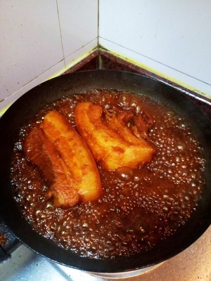 把腌肉的汤汁全部倒入锅里,再加适量的水,大火煮开转中小火盖上锅盖焖煮。