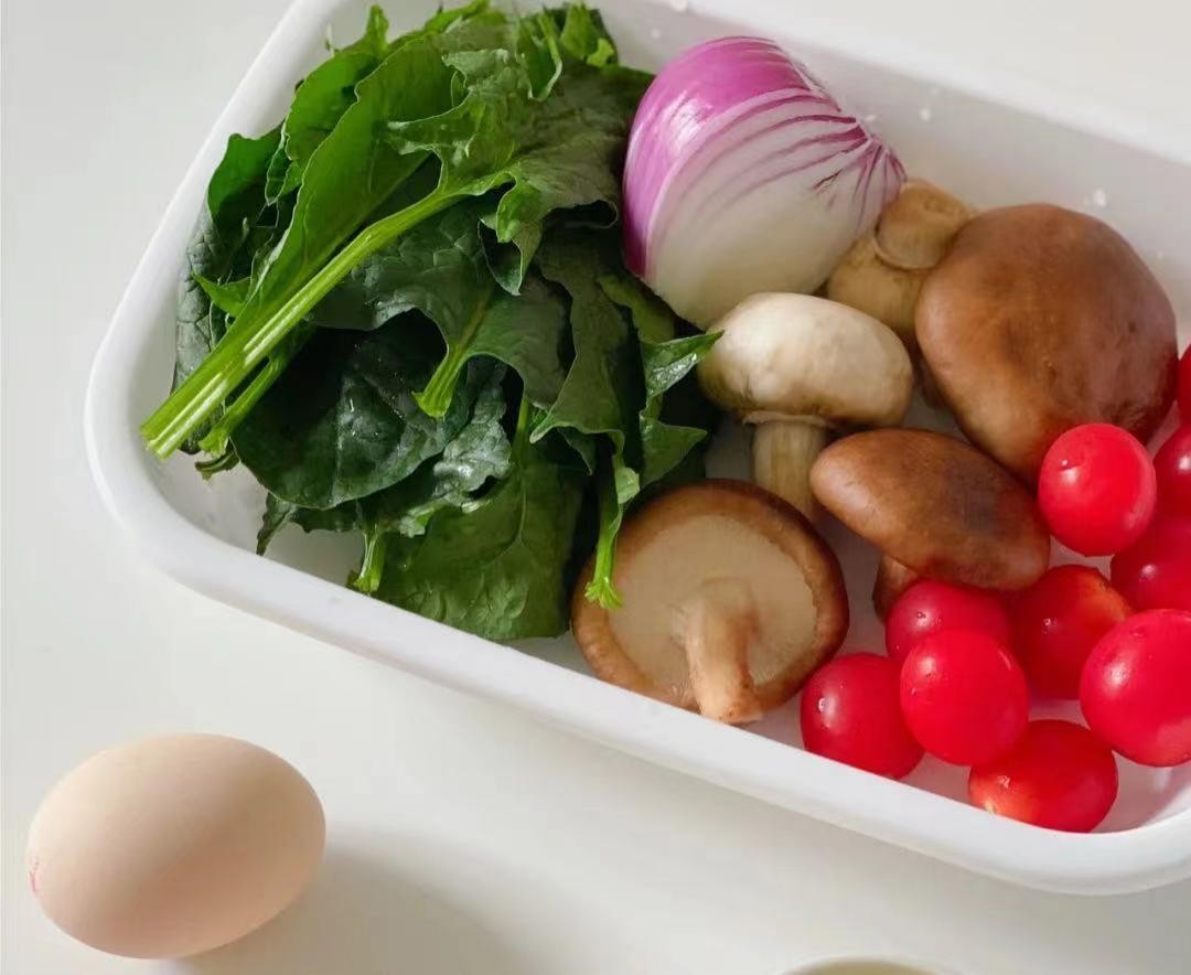 锅中倒入适量食用油,中小火,放入洋葱丁炒香;接着放入蘑菇片和小番茄,翻炒至变软;加入菠菜,一起翻炒至熟(加适量盐和黑胡椒调味)