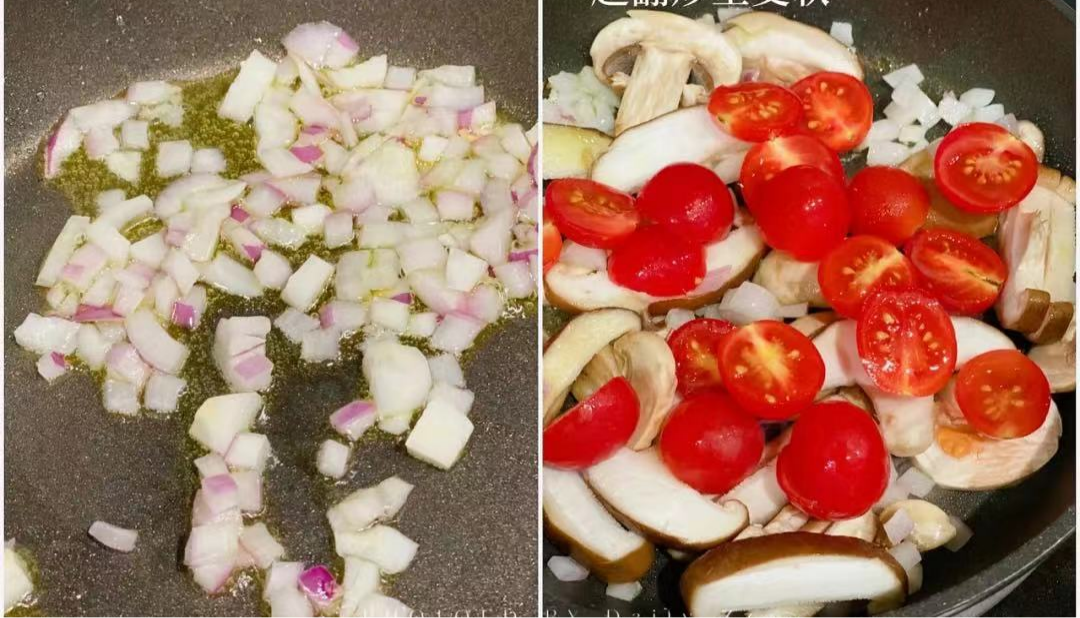 将上述食材洗净备好,蘑菇切片,小番茄切块,洋葱切丁。