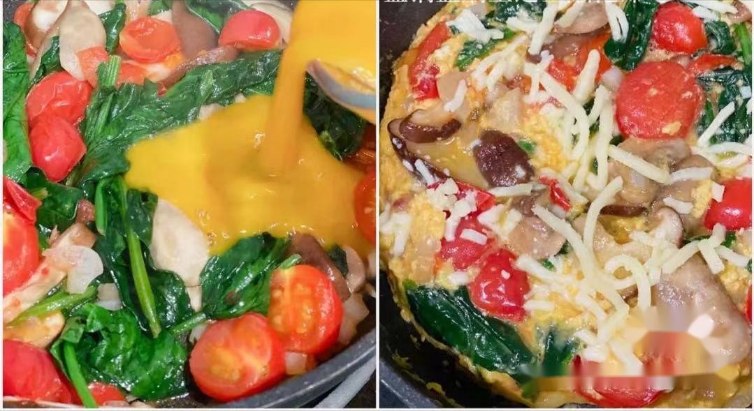 鸡蛋加适量盐和黑胡椒,打散;蛋液倒入炒好的杂蔬中,小火;蛋液凝固后,放入芝士碎,盖锅盖,焖至芝士融化即可。