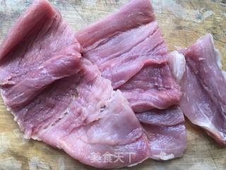 里脊肉洗净切成大片,用刀背敲打肉片五分钟。