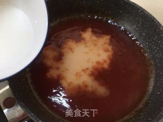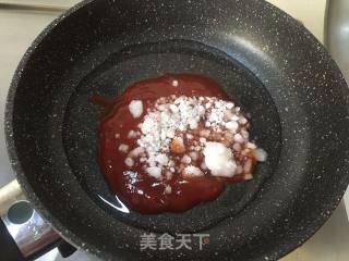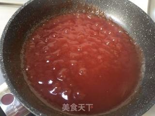 炒锅中放入四汤匙番茄酱三十克白糖,加入少许水,大火烧开。