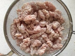 腌好的里脊肉挑出姜丝,放玉米淀粉中裹上淀粉备用。