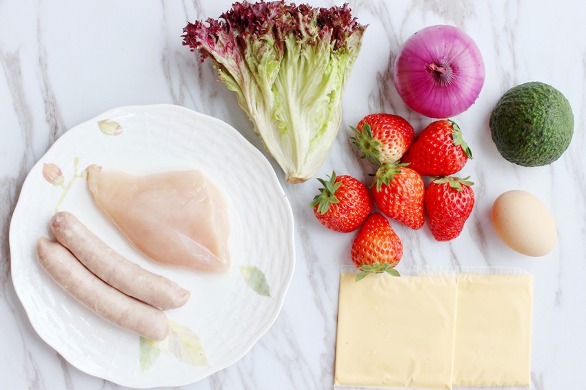 生菜切小段,洋葱切片,牛油果切丁,芝士片切小块,草莓切丁,鸡蛋煮熟切块,猪肉肠切丁,鸡胸肉切丁