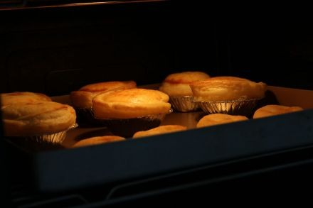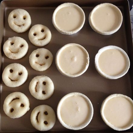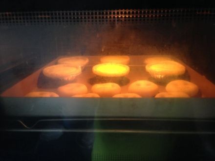 时间到,看到蛋挞表面已经淡淡的焦黄色了,如果没有,可以继续烤几分钟,或者把烤盘挪上一层;
