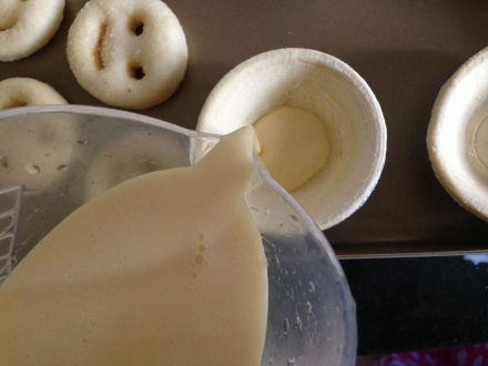 倒入准备好的蛋挞皮里,蛋挞皮是冷冻的,不用解冻,直接拿出来就可以用了;