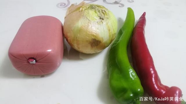 将青椒,红椒,洋葱,洗干净取用适量依次分别切成小丁,火腿肠切成小丁。虾米少许放入盘中备用。