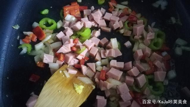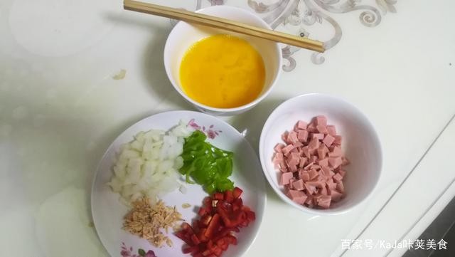 准备好所需要的食材,米饭,鸡蛋,洋葱,青椒,红椒,火腿肠,葱,虾米,先将鸡蛋打破到碗中,筷子打散,放入少许盐搅拌均匀后置放备用。