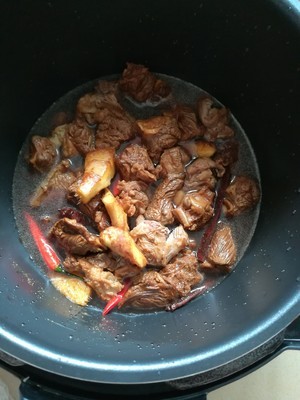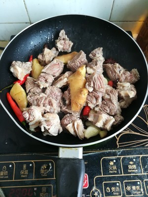 在所有配料爆香后,倒入牛腩,稍微煸炒下后倒点老抽上色
