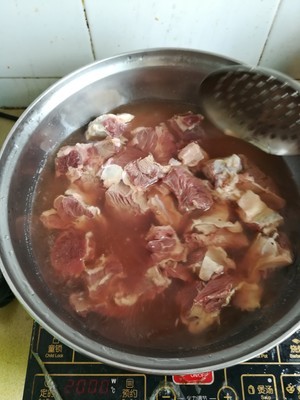 冷水下锅,煮出血沫,如果想牛肉味重一点水煮开就行,怕牛肉味太重的就多煮一下