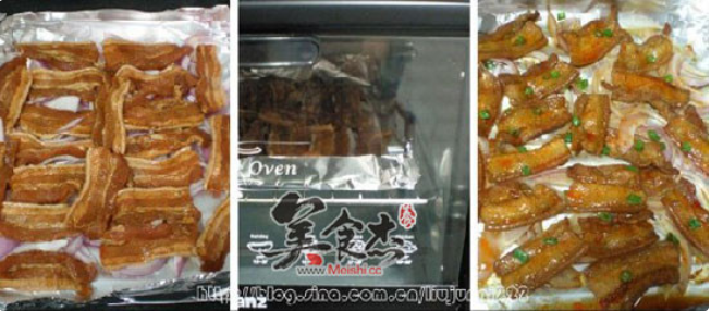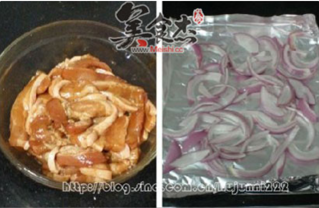 洋葱洗净后切成丝,平铺在垫有锡纸的烤网上。将腌制好的五花肉一块块地铺在洋葱上面,放入预热好的烤箱中层,上下火,230度烤约15分钟。