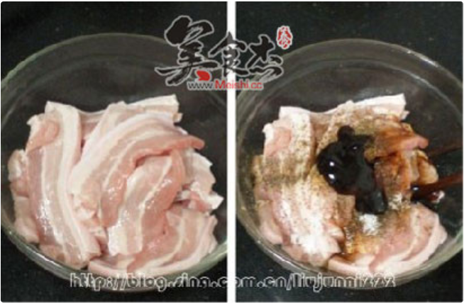 将切片好的带皮五花肉洗净沥干,放入碗中,加入适量的盐、蚝油、料酒、生姜粉、孜然粉、酱油、辣椒粉、辣椒油,拌匀后腌制一小时左右。