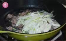 待羊肉片开始陆续变白时,加入葱丝继续快手翻炒均匀