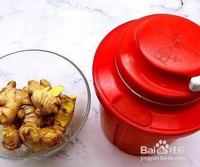准备好所有的食材,生姜去皮洗净切片,放入特切剁器中打碎,再将姜末用纱布包裹挤出姜汁