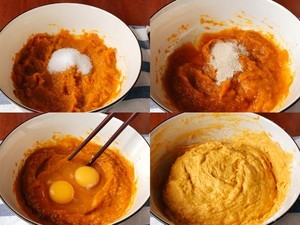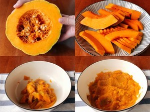 新鲜的南瓜去皮去籽切薄片(250克)放蒸锅蒸熟(20分钟)取出后倒掉里面的水分,再压成南瓜泥