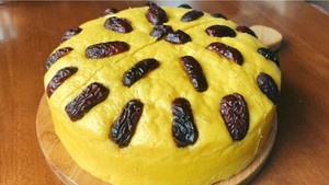 二次发酵好后,体积明显变大,上面摆一层红枣,直接冷水上锅开大火蒸20分钟,关火焖3分钟