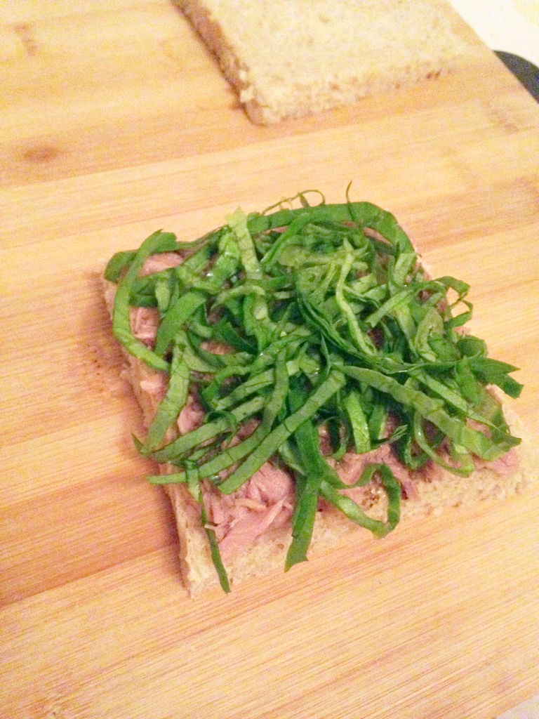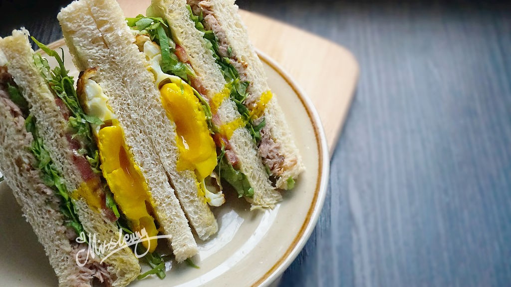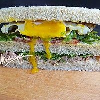吐司切片,生菜切丝,番茄切薄片,鸡蛋煎单面,金枪鱼剁碎烤熟