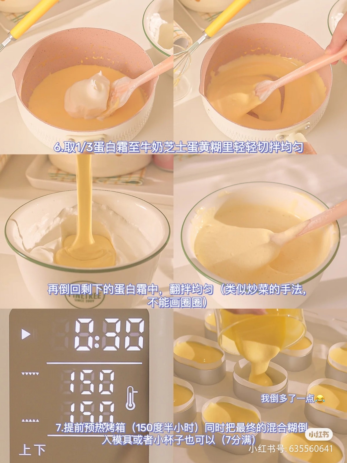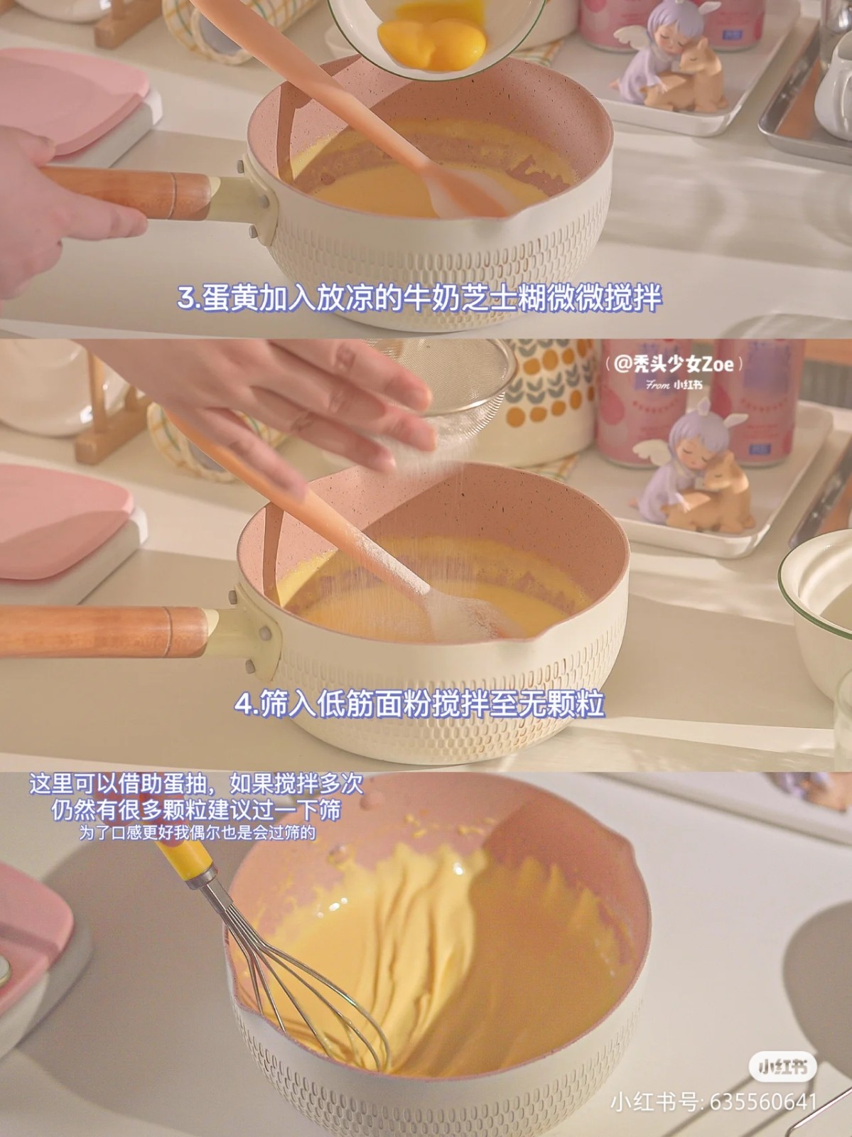 蛋黄加入放凉的牛奶芝士糊搅拌,加入低筋面粉