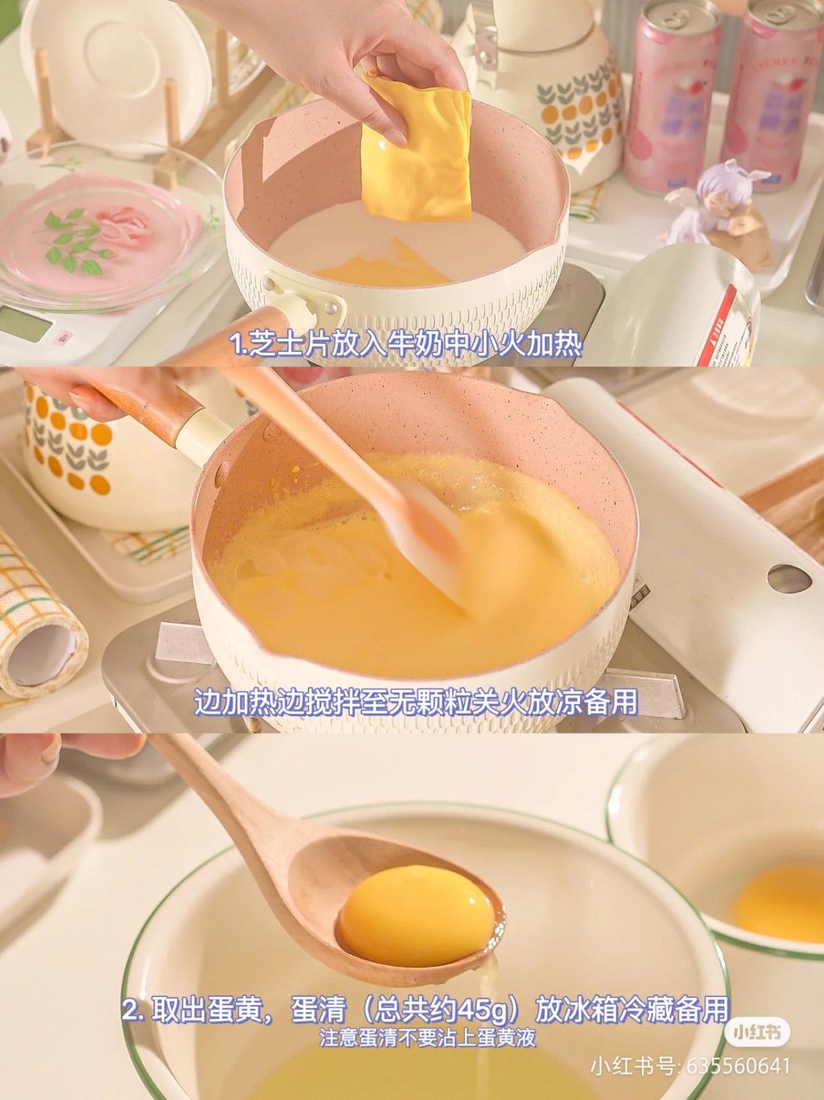 小火加热牛奶和芝士片,蛋黄蛋清分离并冷藏