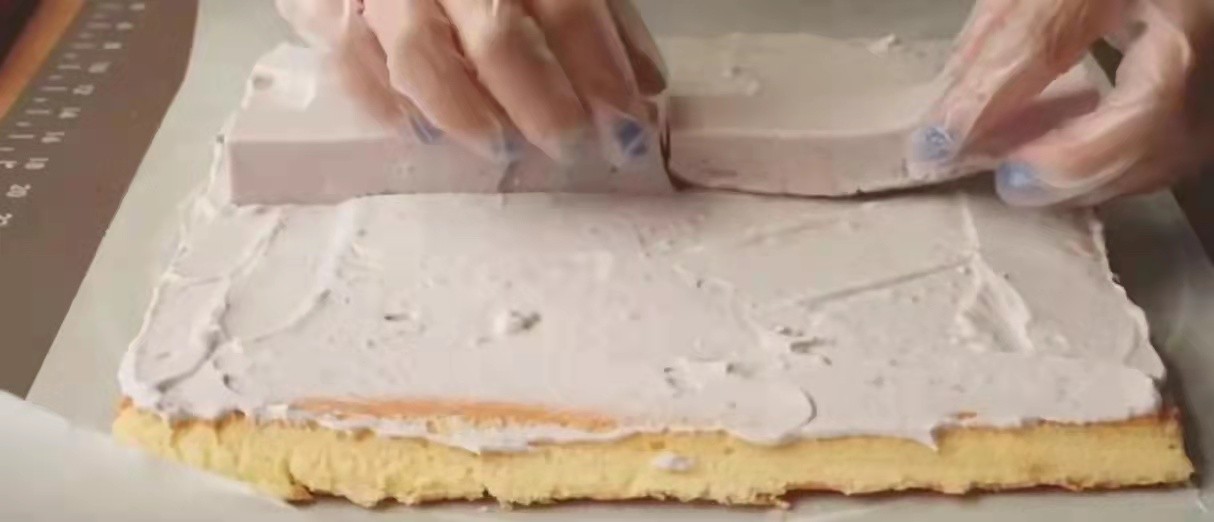 6.第六步 将我们的蛋糕放在烘焙纸上面,将其边缘用小刀将其切除,其他三边也需要切除。将我们的御泥奶油均匀的涂抹在上面,再将条状的芋泥奶冻放在蛋糕的中间。好轻轻地将其卷起。到之后我们将其放冰箱冷藏一下,定一下型。这样我们的芋泥奶冻蛋糕卷就算做好了。