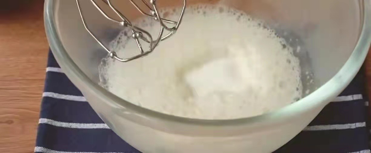 3.第三步 将冷藏好的蛋清从冰箱取出来,在里面加几滴香草精(目的是为了去除腥味),然后打开我们的打蛋器,全程用低速打发,打发的过程中分三次将我们的白砂糖或者是代糖加入其中,打发至我们提起打蛋器,前面有个小尖尖就可以了。