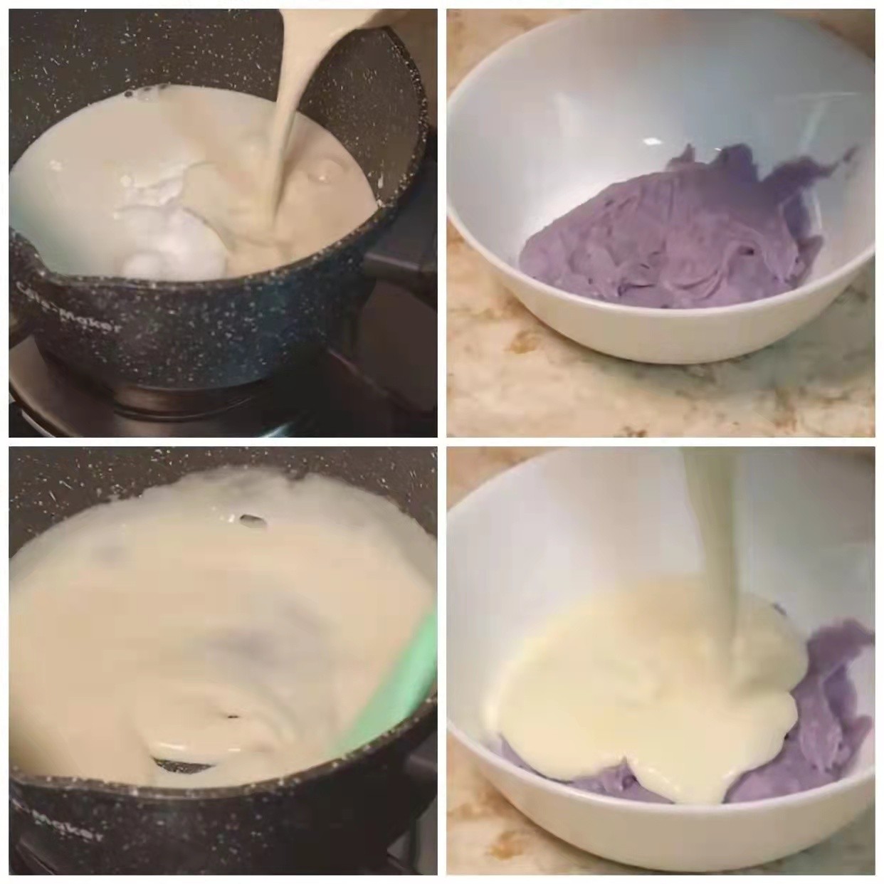 1.第一步 将准备好的吉利丁片5克,用剪刀将其剪成小块,放在倒入清水的碗中,将其泡软,后再放到旁边备用。准备一口干净的小锅,将代糖55克,玉米淀粉10克,奶油50克百55克都倒入锅中,然后开小火,在加热过程中不断地用铲子搅拌面糊,防止其糊底,夜壶呈现黏稠状态时就可以了。将我们自制好的芋泥60克放入碗中,最后将我们的面糊倒入其中,用搅拌器将其搅拌均匀,待其基本均匀之后,将我们泡软了吉利丁片放入其中,继续用搅拌器搅拌。在模具上铺一层保鲜膜,将我们混合好的面糊倒入其中。将其盖好放冰箱冷藏一夜。