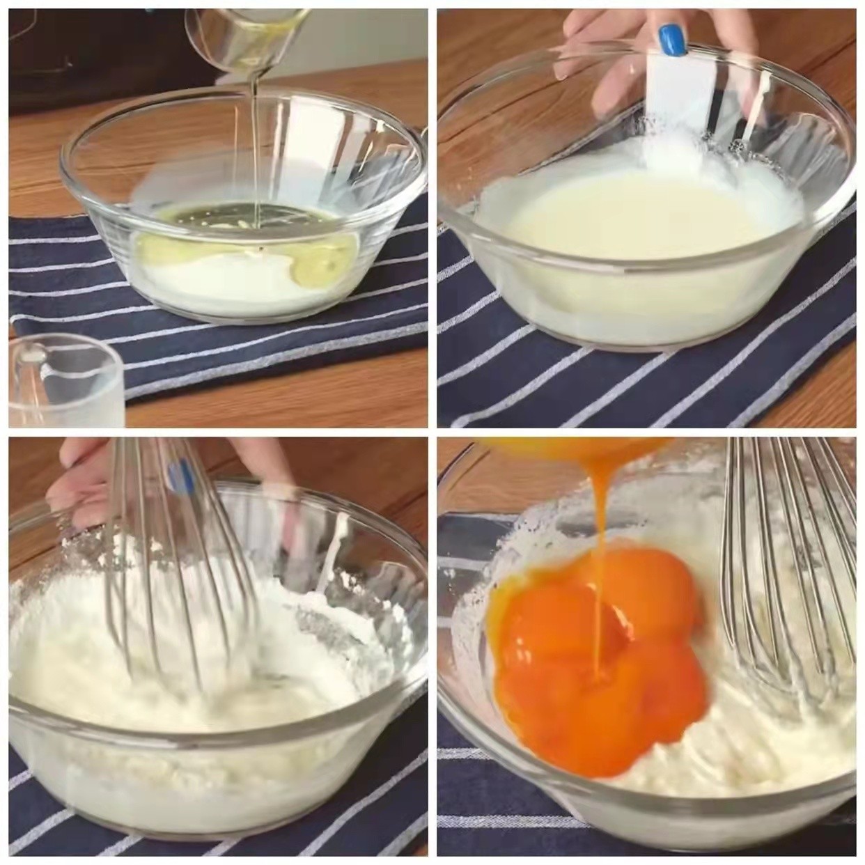 2.第二步 将蛋黄和蛋清分离,然后将蛋清放冰箱中冷藏。取一个干净的大碗,将我们的牛奶和玉米油倒入其中,搅拌器将其搅拌至乳化状态(没有油腥),之后再加入我们的蛋黄,去搅拌搅拌至顺滑无颗粒。