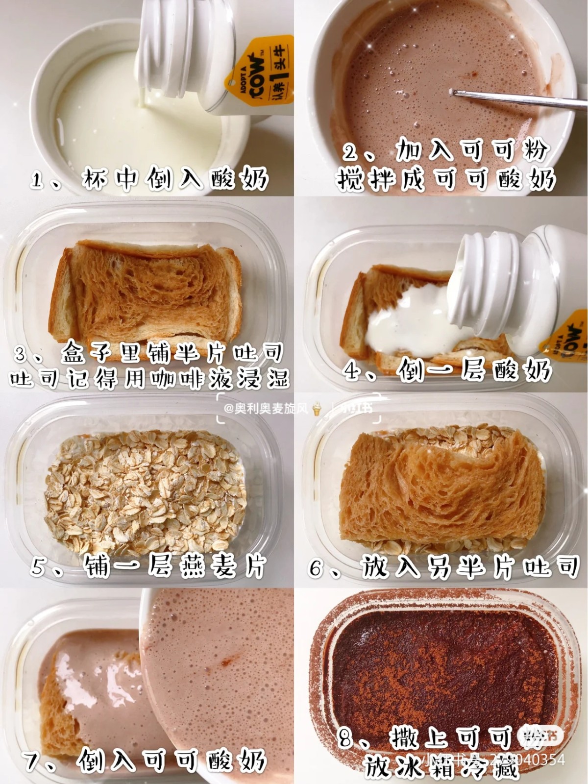 杯中倒入酸奶,加入少量可可粉搅拌 吐司切半,用咖啡液浸湿,先铺半片吐司再加一层酸奶和一层燕麦片 再加剩余的半片吐司和可可酸奶