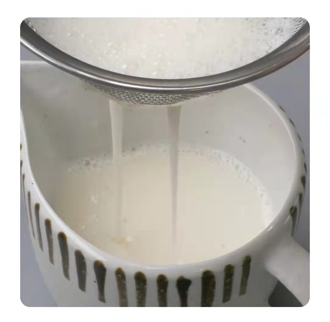 蛋奶沿着小洞倒回之前的碗里,第一层奶皮会顺着浮动起来